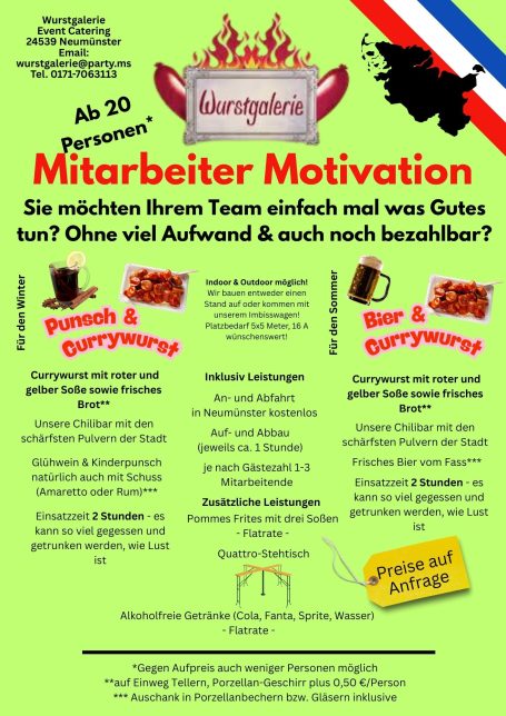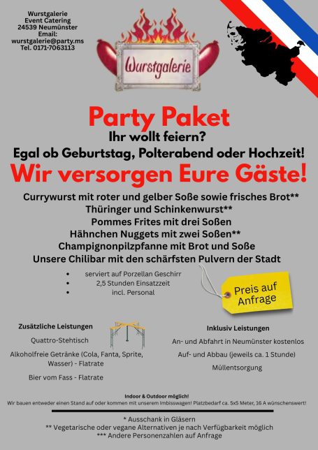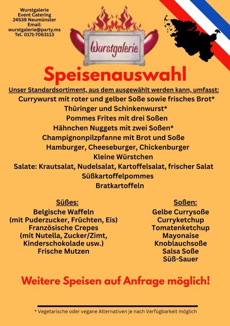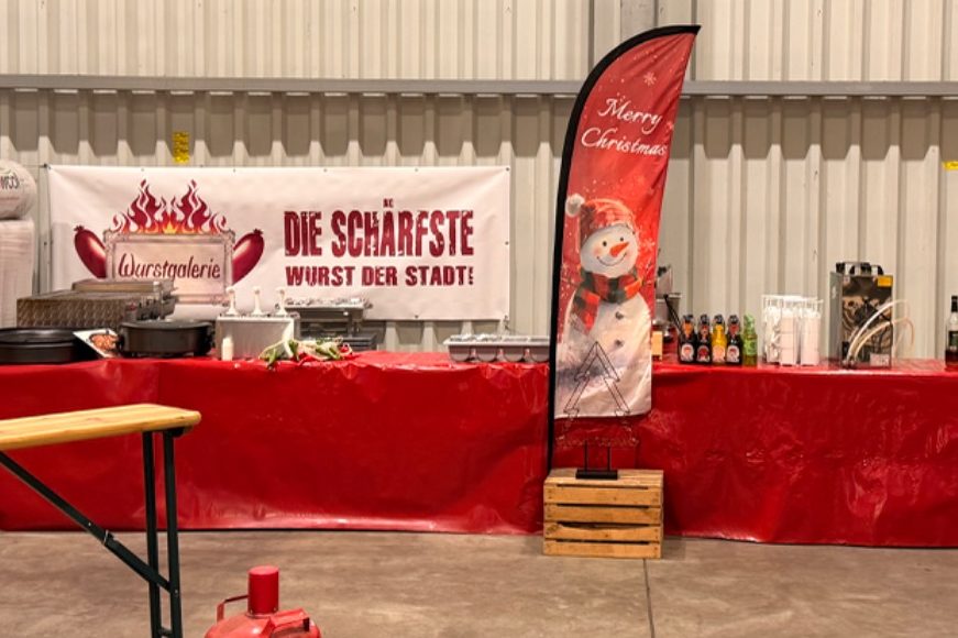 Wurstgalerie bietet erstklassiges Imbiss Catering für Firmenfeiern und private Veranstaltungen. Genießen Sie eine Vielzahl an köstlichen Speisen, von klassischer Currywurst und Pommes bis hin zu herzhaften Burgern. Runden Sie Ihr Event mit unseren verführerischen Desserts wie Mutzen, Crepes oder Waffeln ab – für jeden Geschmack ist etwas dabei!