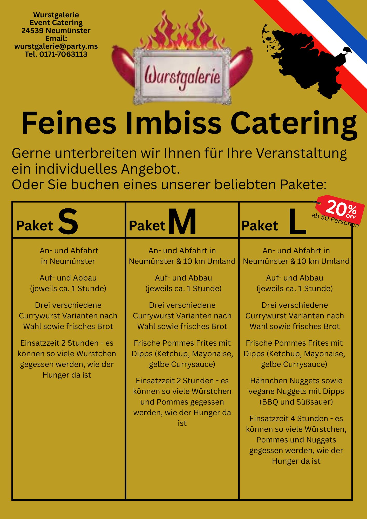 Wurstgalerie bietet erstklassiges Imbiss Catering für Firmenfeiern und private Veranstaltungen. Genießen Sie eine Vielzahl an köstlichen Speisen, von klassischer Currywurst und Pommes bis hin zu herzhaften Burgern. Runden Sie Ihr Event mit unseren verführerischen Desserts wie Mutzen, Crepes oder Waffeln ab – für jeden Geschmack ist etwas dabei!